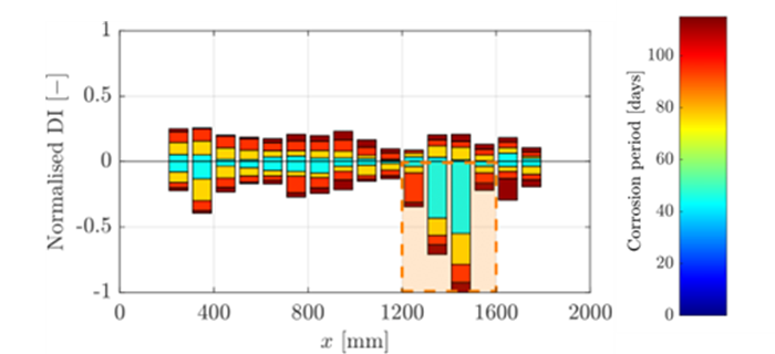 Damage indicator based on the strain mode shapes for increasing corrosion degrees of a locally corroded beam. The damaged zone is highlighted in orange.